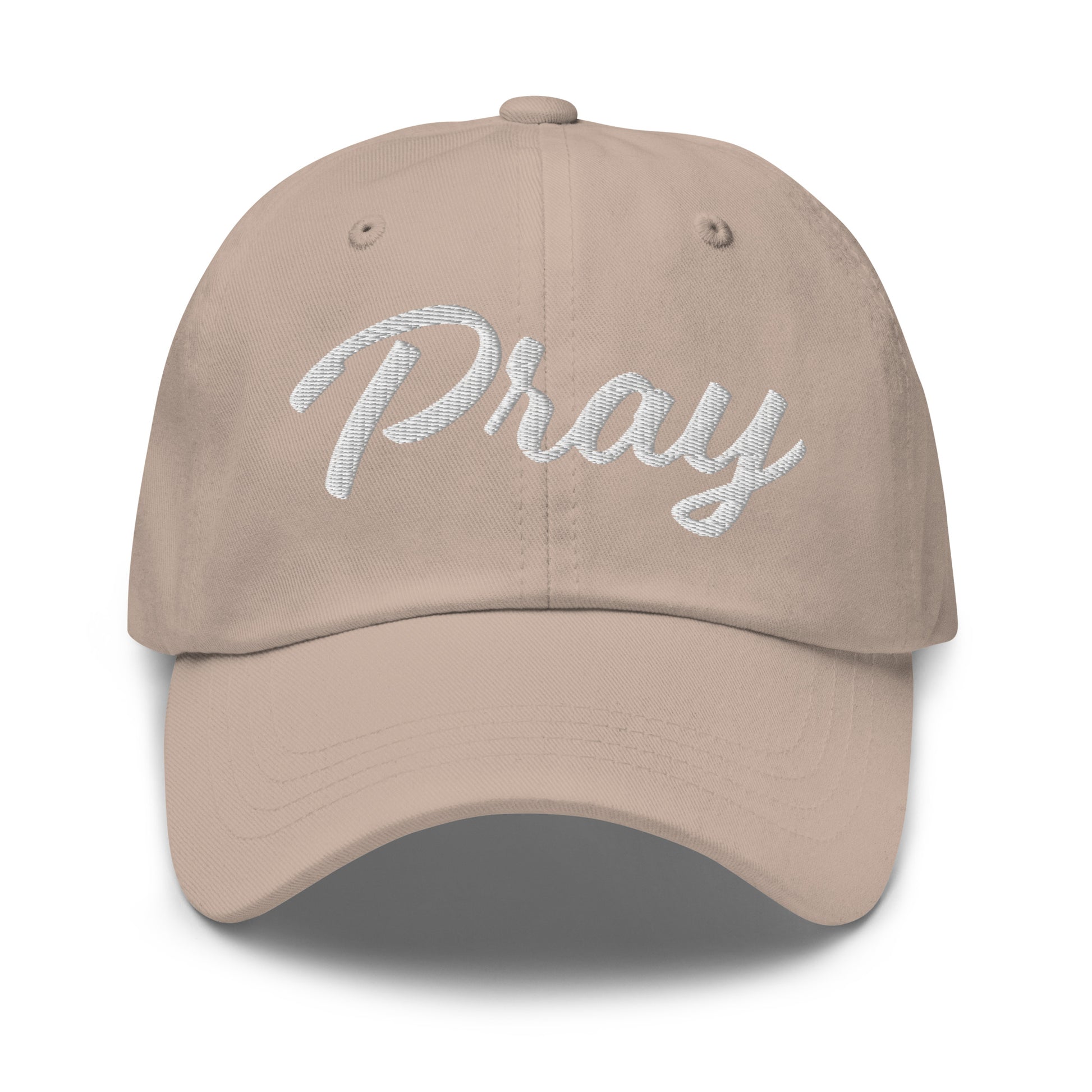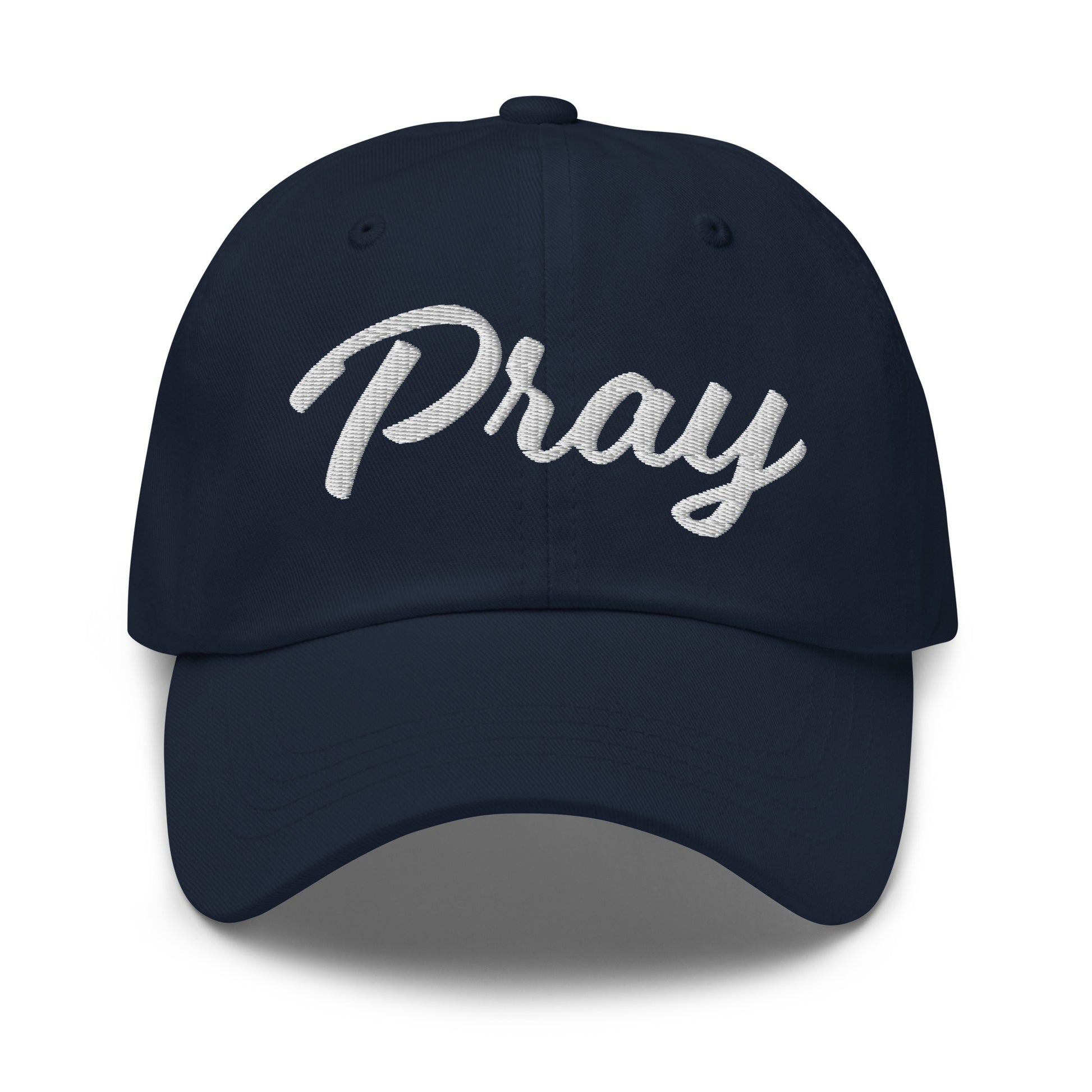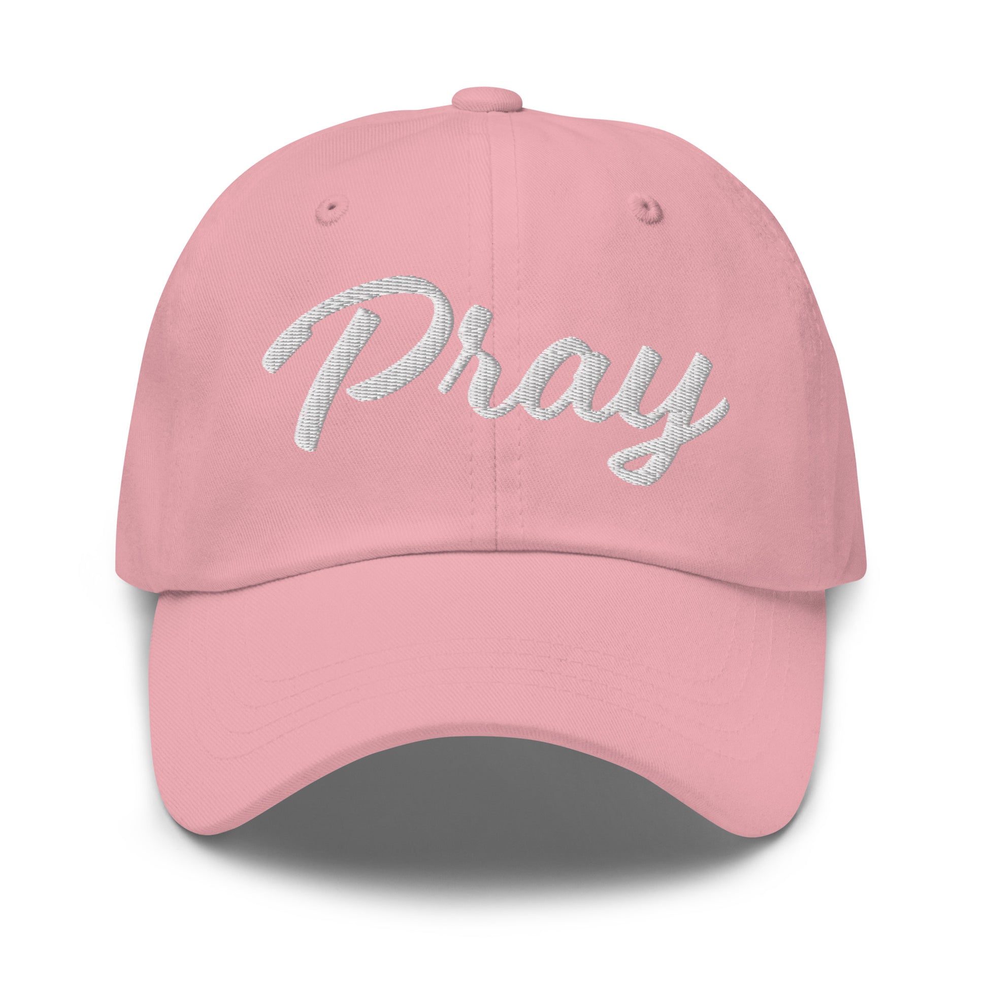 This Pray hat has a feminine font and serves as a reminder to turn to Prayer. It has a low profile with an adjustable strap and curved visor.