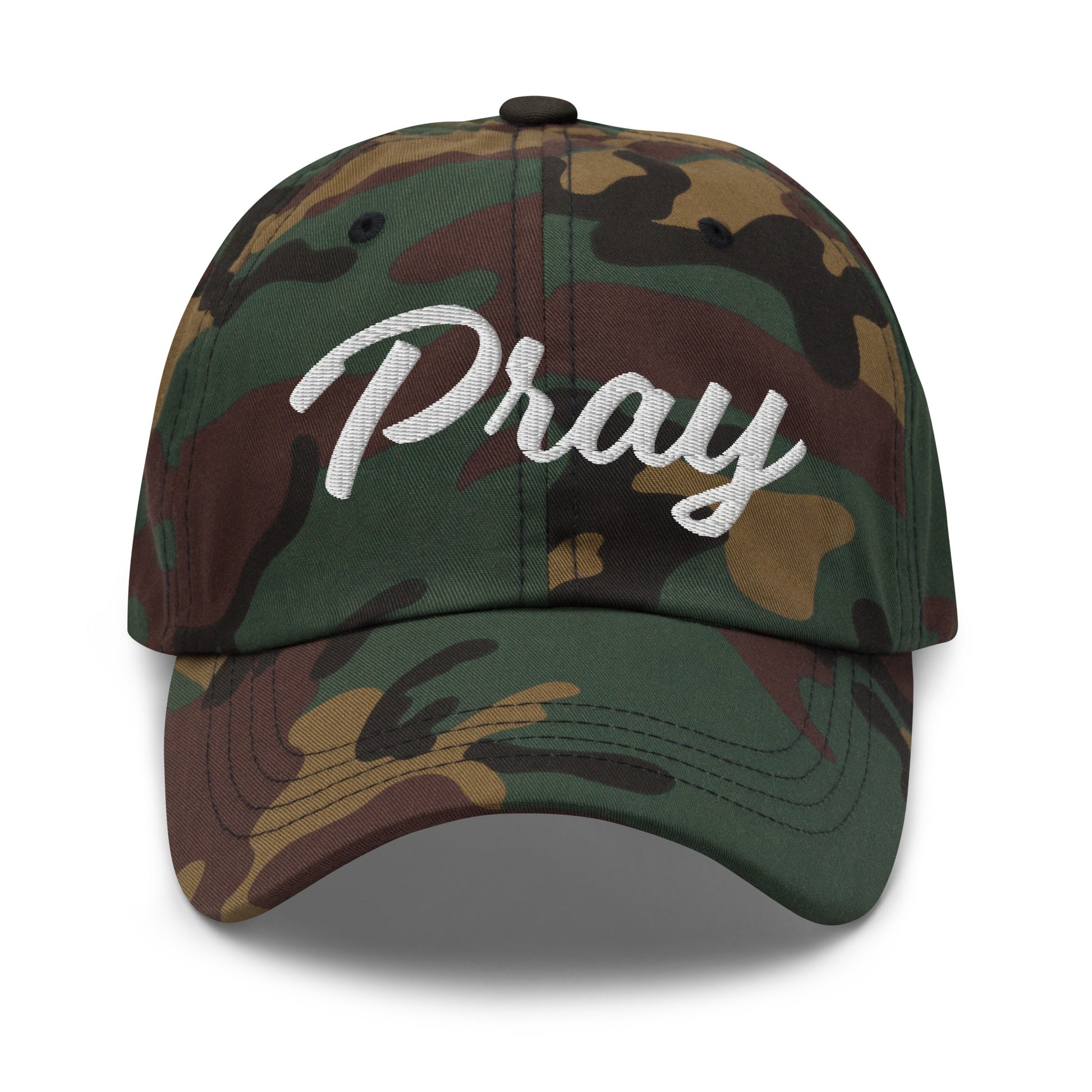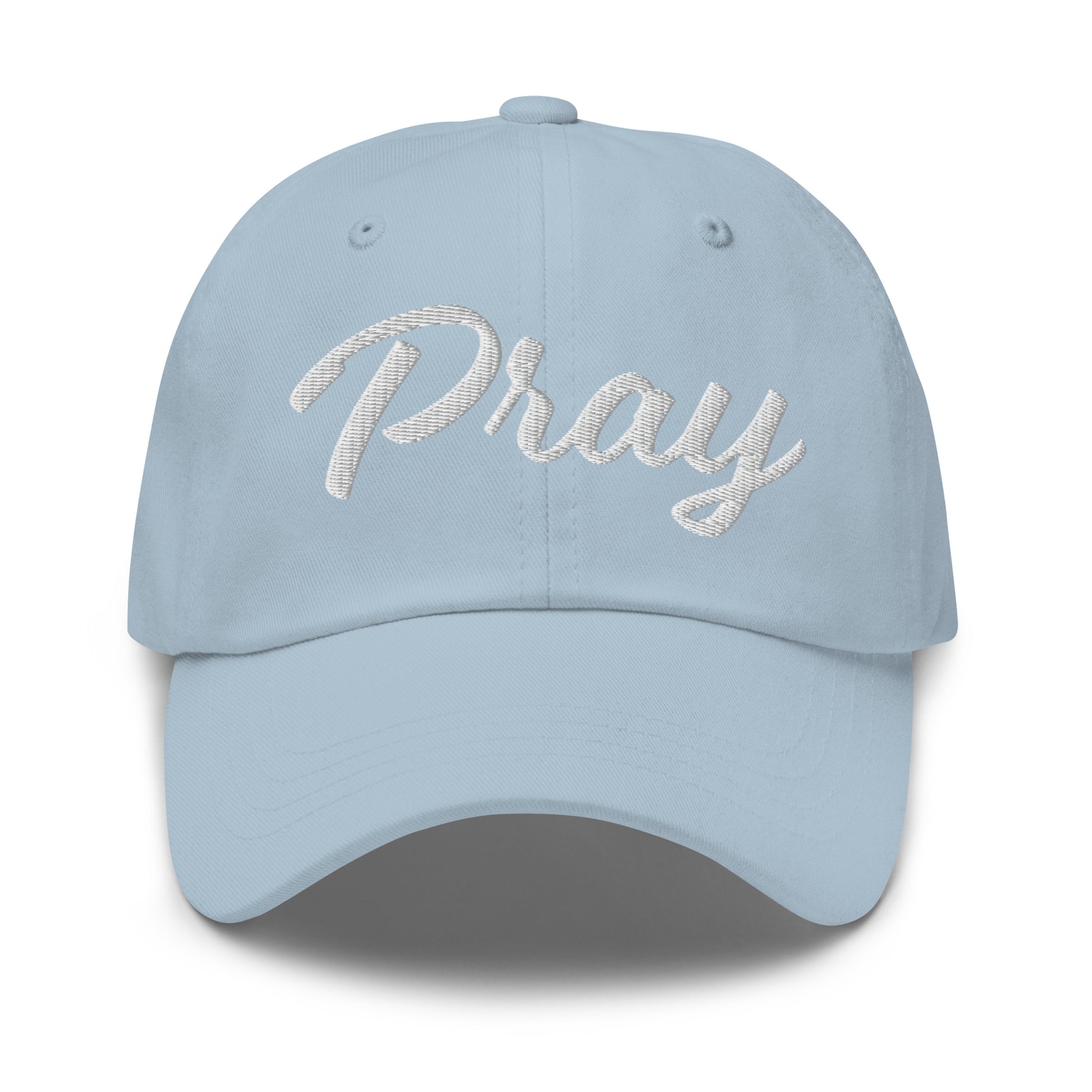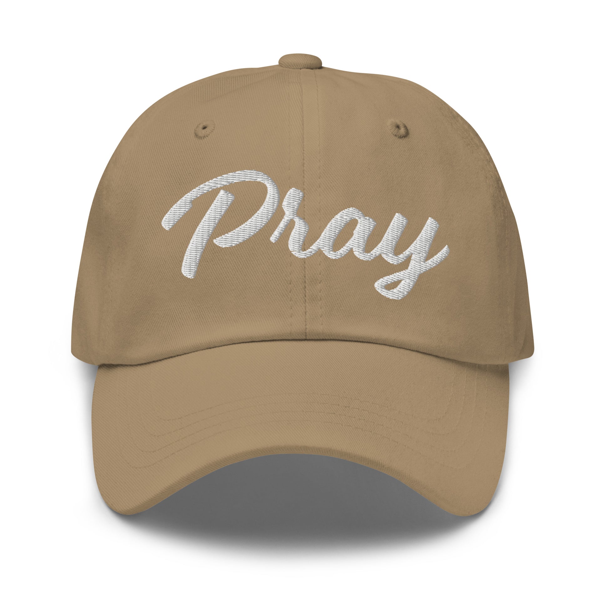 This Pray hat has a feminine font and serves as a reminder to turn to Prayer. It has a low profile with an adjustable strap and curved visor.